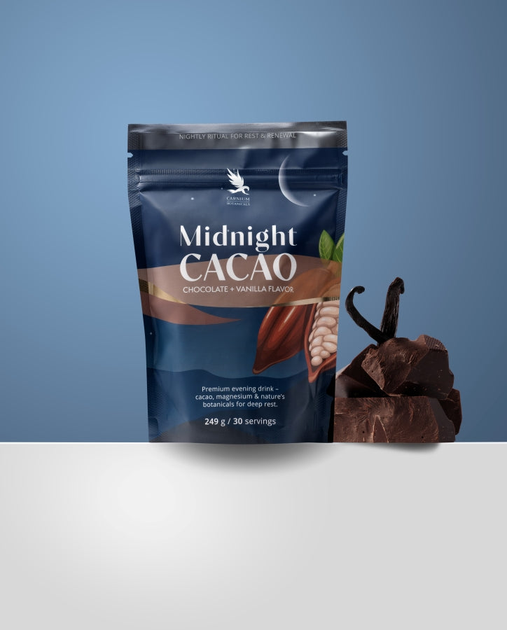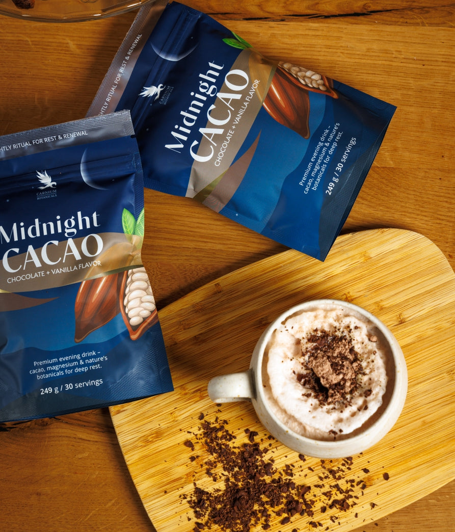 Midnight CACAO è un integratore alimentare sotto forma di bevanda serale. È pensato per l’uso serale come parte di una routine rilassante a fine giornata.